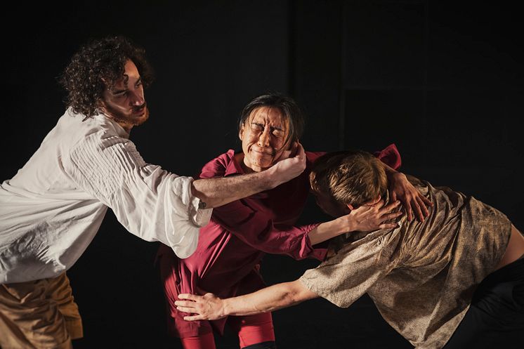 Blushing Gold, koreografi Heidi Vierthaler har världpremiär på Skånes Dansteater 12 nov 2022. Dansare i bild: Dario Minoia, Jing Yi Wang, Tiemen Stemerding.