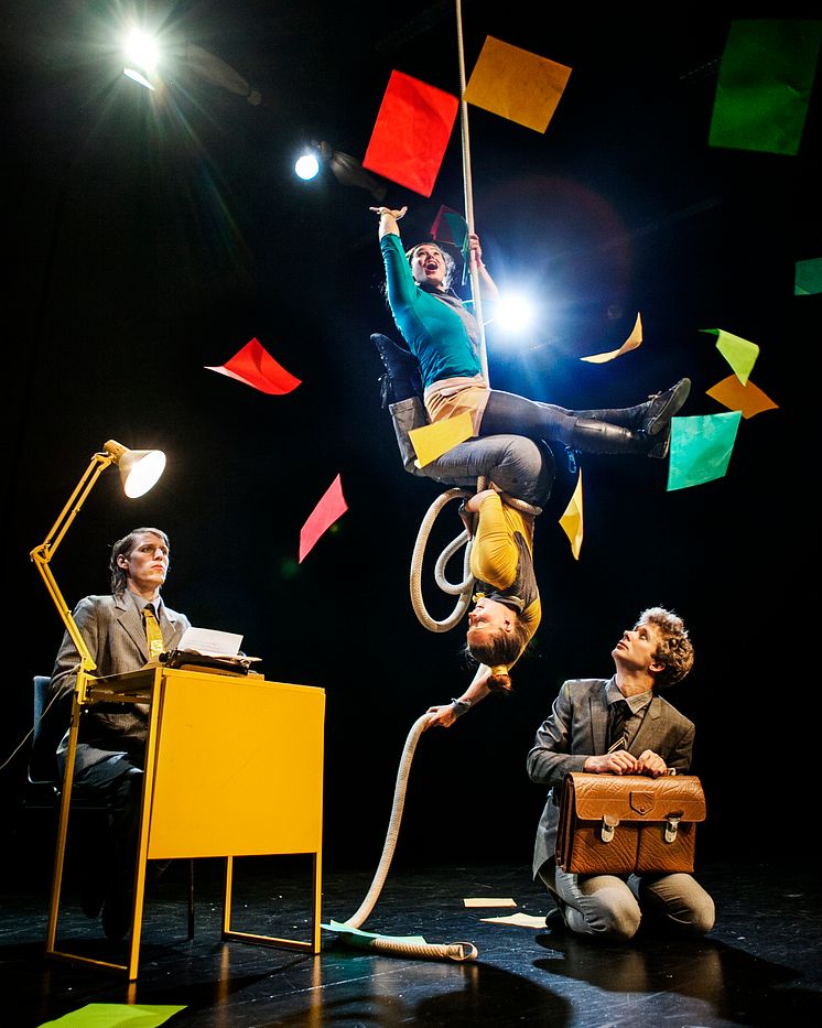 Bland papper, portföljer och tillknäppta kostymer gör de allt för att upprätthålla ordning. Under den strikta ytan börjar något röra sig. En kittlande föreställning med livemusik, fysik teater, magi och luftakrobatik.