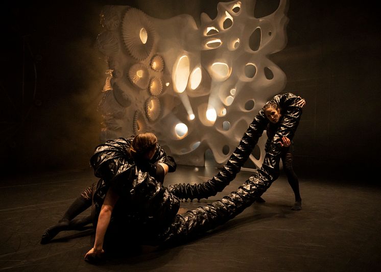 in:finite i koreografi av Wubkje Kuindersma. Världspremiär på Skånes Dansteater 11 maj 2023. Dansare i bild: Jeanne Delsus, Maria Pilar Abaurrea Zardoya.