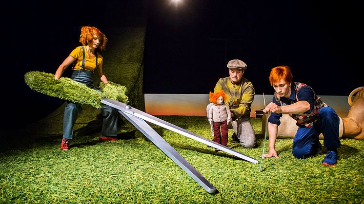 Scenen är täckt av gräs och en halv bil är på väg in. Luckor öppnas. Två rödhåriga figurer och en fikasugen granne dyker upp. Regnet jonglerar under ett moln. Tussar blir tankebubblor. Ett fantasifullt samarbete mellan Marionetteatern och Claire Parsons Co.
